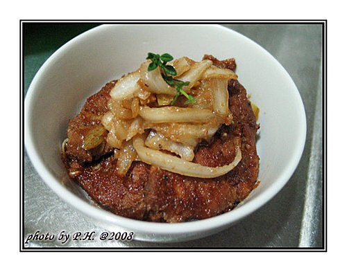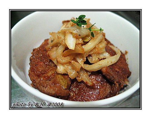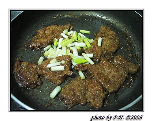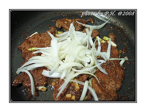 7. 將切絲的洋蔥放入鍋中,與已經烤紅的肉排拌炒一下,即可裝盤。
