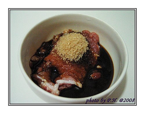1.醬油、水、黃砂糖與豬肉排攪拌。